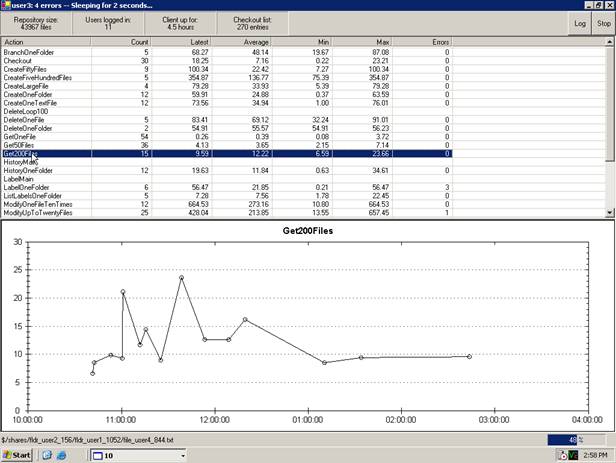 We usually set the sleep time fairly low, averaging around 30 seconds between actions. , Real users don't perform a source control operation that often. However, with a low idle time between actions, when we run a simple test with say 10 Crowd Test clients simultaneously, we are actually burdening the server with a load that is higher than that which would be caused by 10 human users.