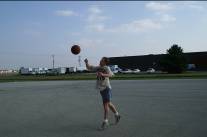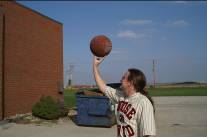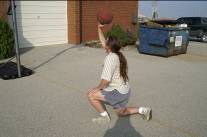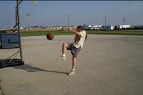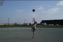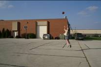 One handed, standing on one foot. The particular shot shown in this photo is called "The Stork King", so named because of the unusually great distance between the shooter and the hoop. |