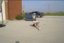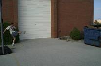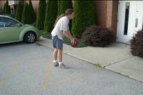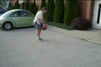 The shooter and the drop-kick must be contained entirely within the trapezoid (as defined by the yellow lines on the pavement). On the kick, the ball must hit the wall of the building. Shooter must recover after a specified number of bounces and shoot from within one pivot of the place where he recovers the ball. So, if someone calls "Trapezoid and 3", that means 3 bounces after the kick hits the wall. |